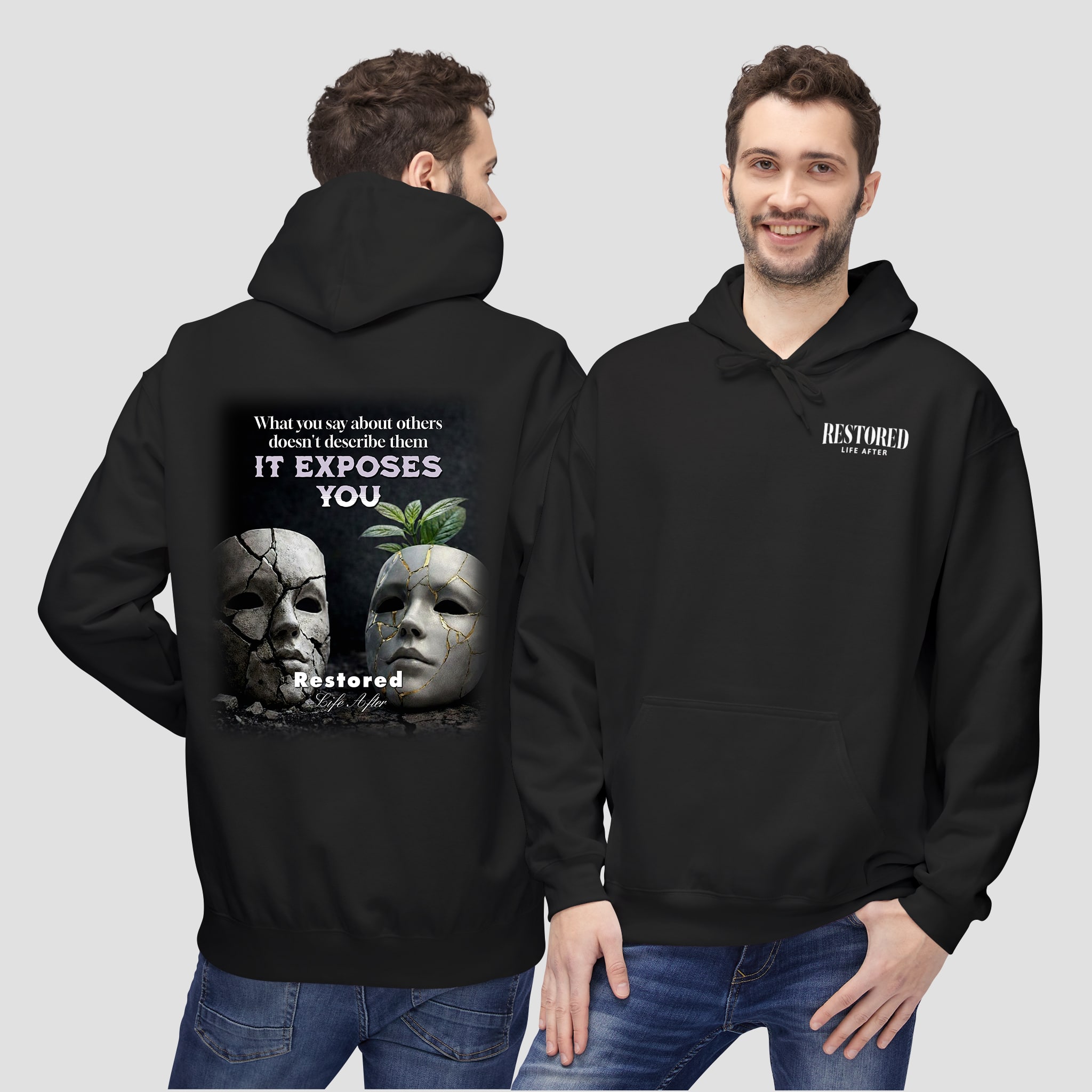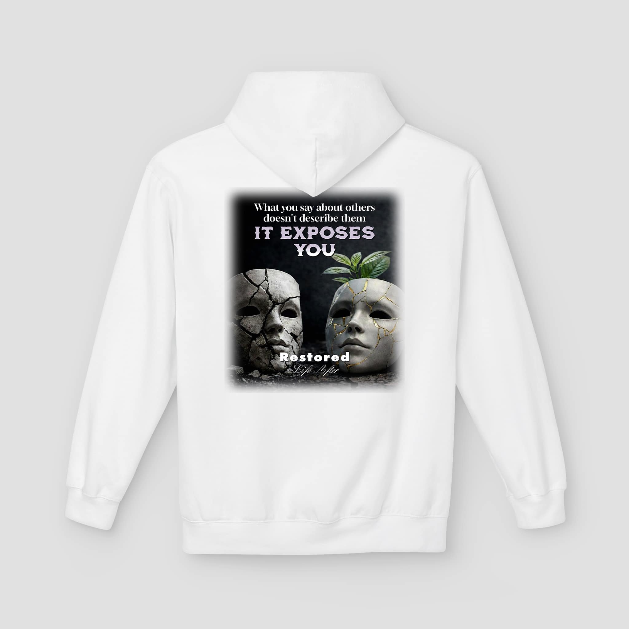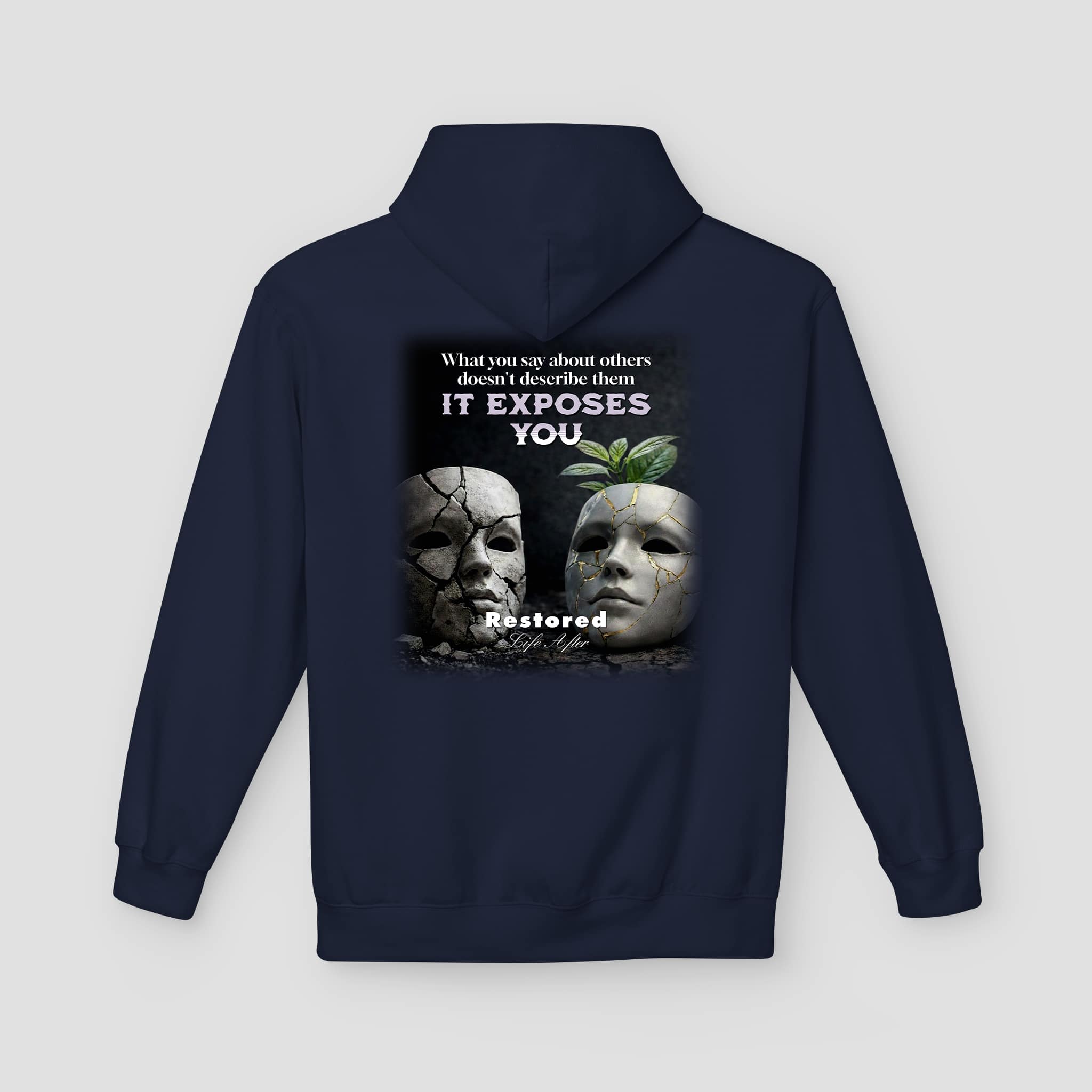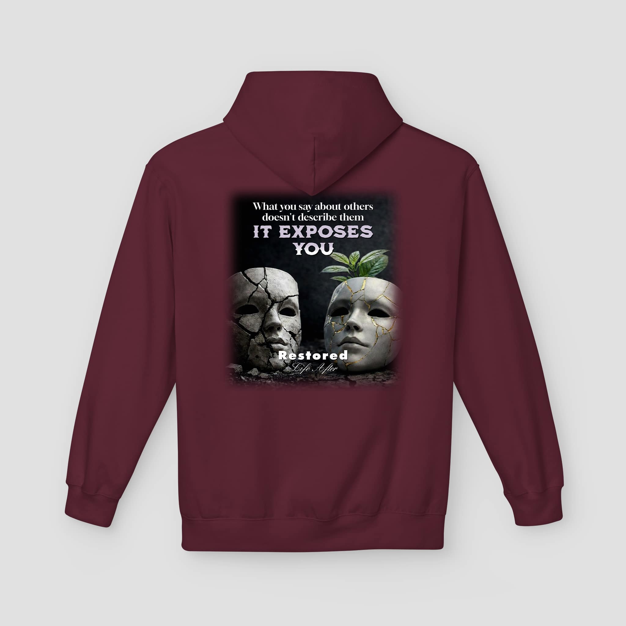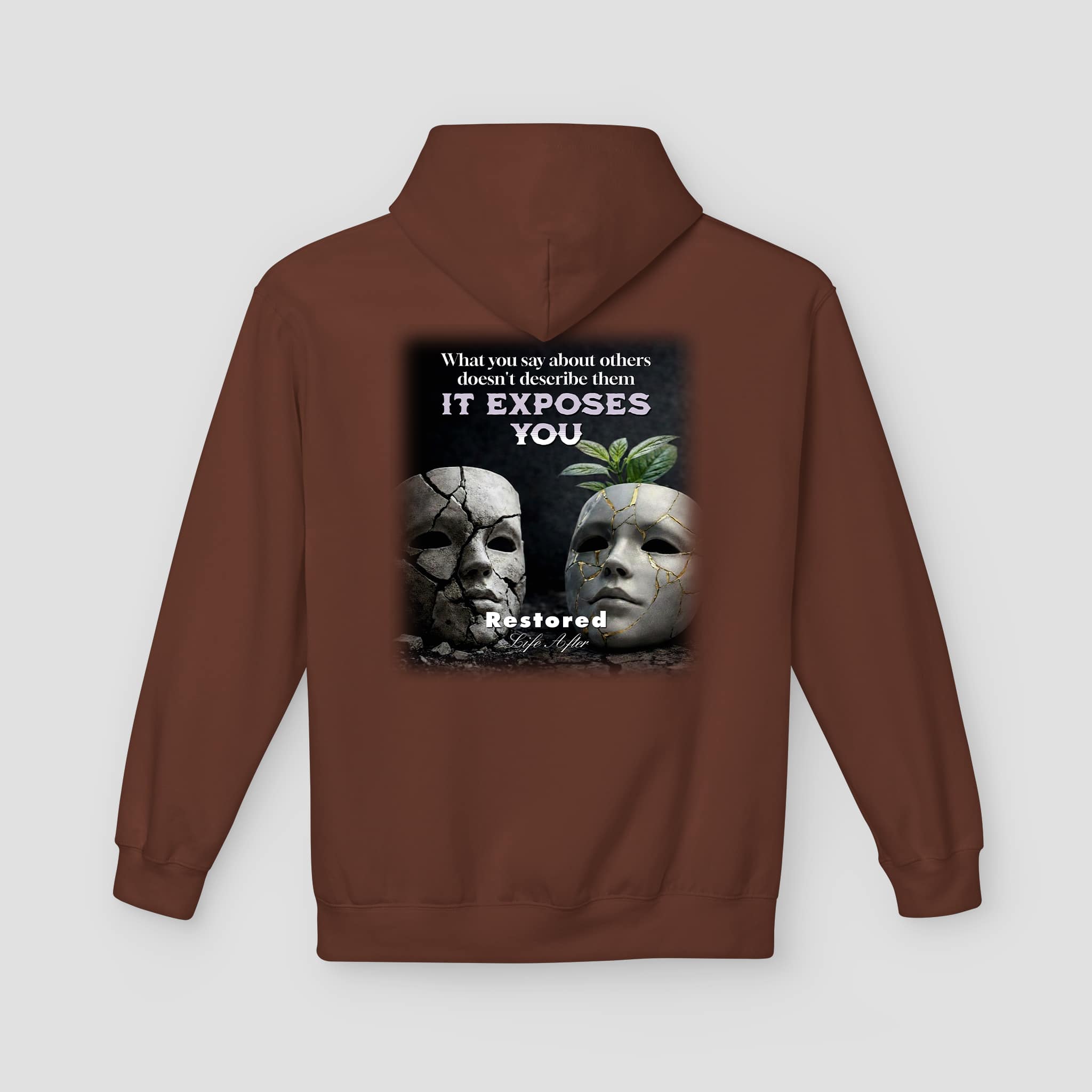 The It Exposes You Graphic Hoodie combines thoughtful design with everyday comfort. The front features a small, clean logo that keeps the look simple. Meanwhile, the back shows a bold graphic that represents truth, exposure, and renewal. The artwork blends cracked masks with a fresh leaf. Together, these elements symbolize growth after honesty and reflection.