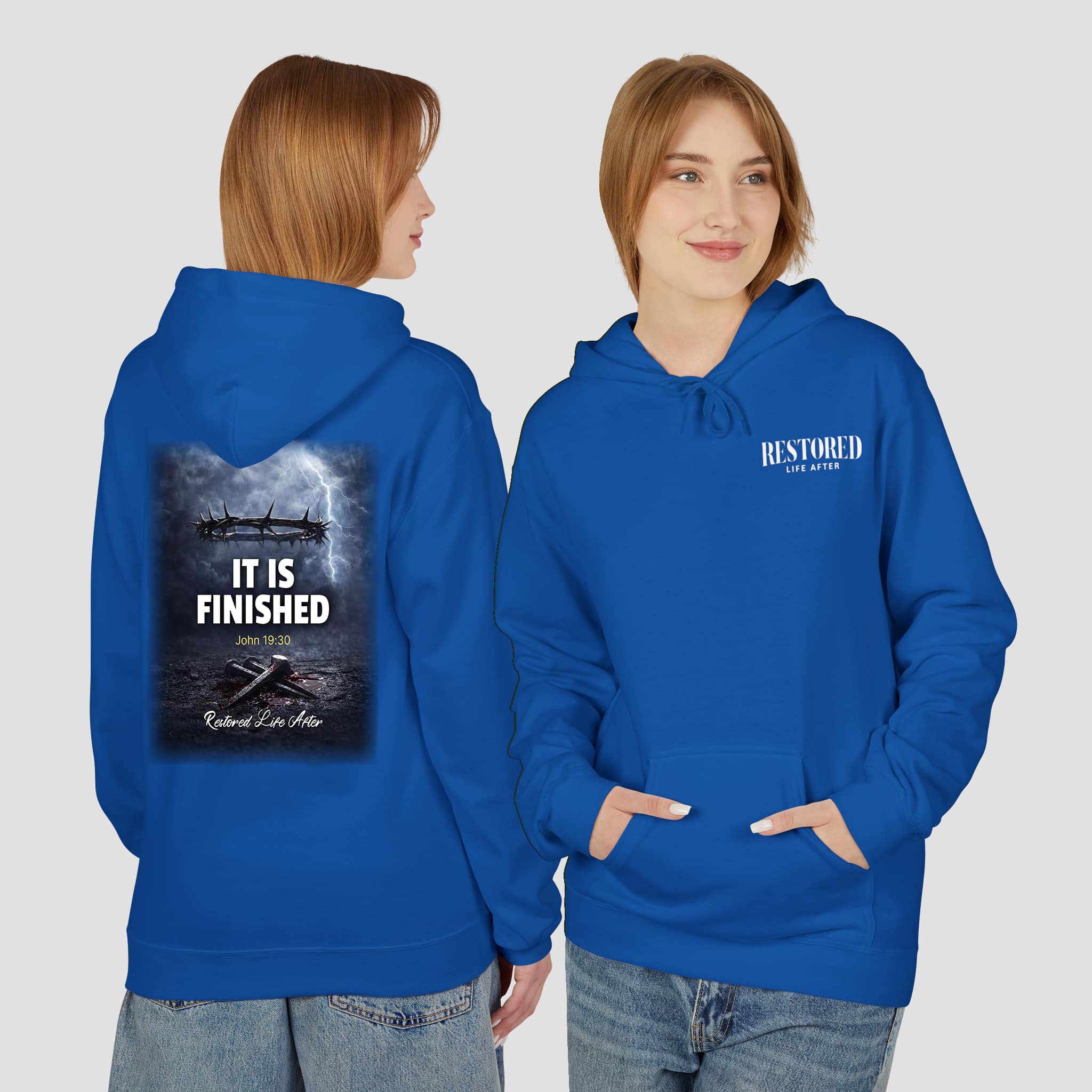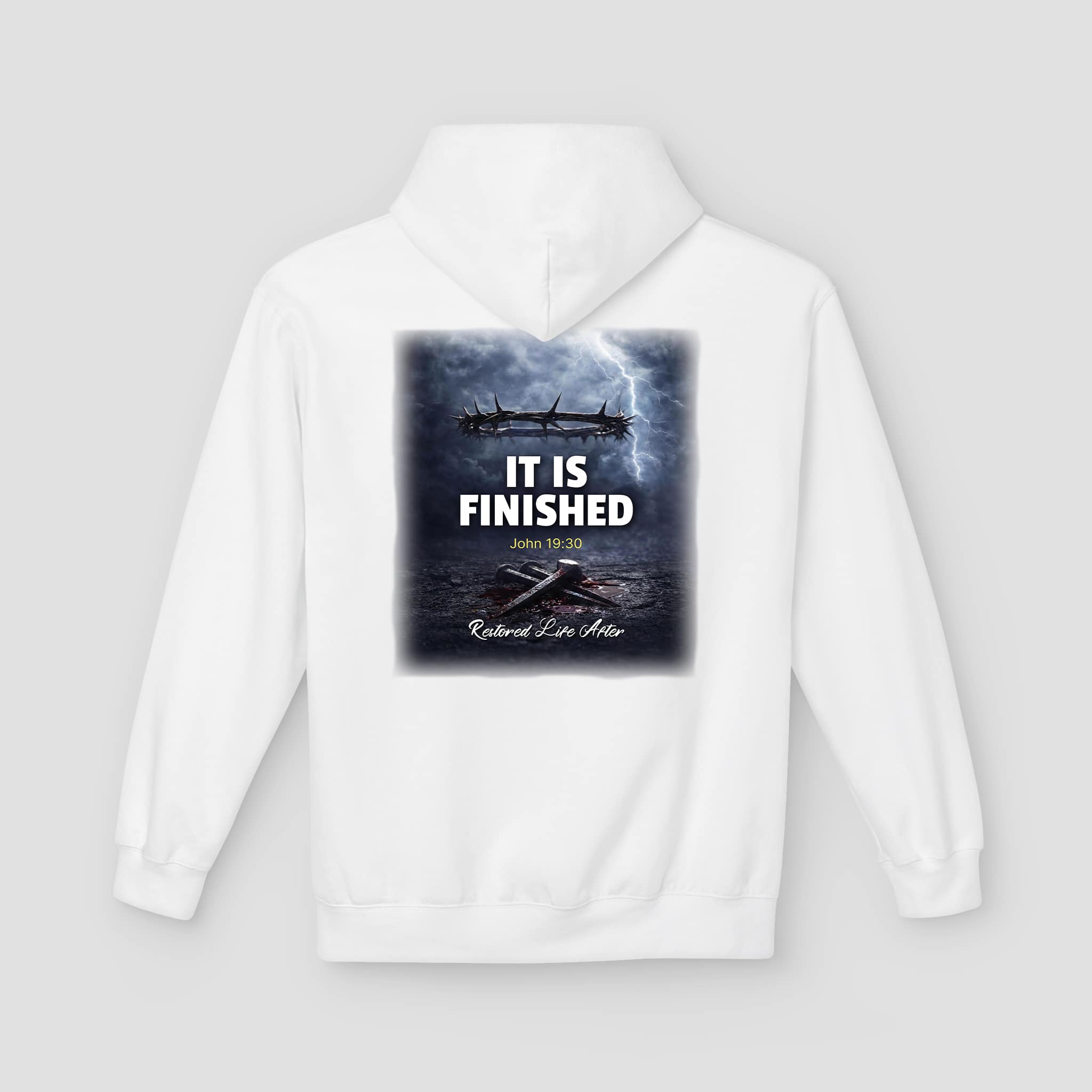 ✝️ The It Is Finished John 19:30 Christian Hoodie shares a powerful message of faith and victory. The back design displays the Bible verse “It Is Finished” (John 19:30) over a dramatic seascape graphic. This design reflects hope, strength, and the finished work of Christ. At the same time, the small front wordmark keeps the style clean and meaningful.