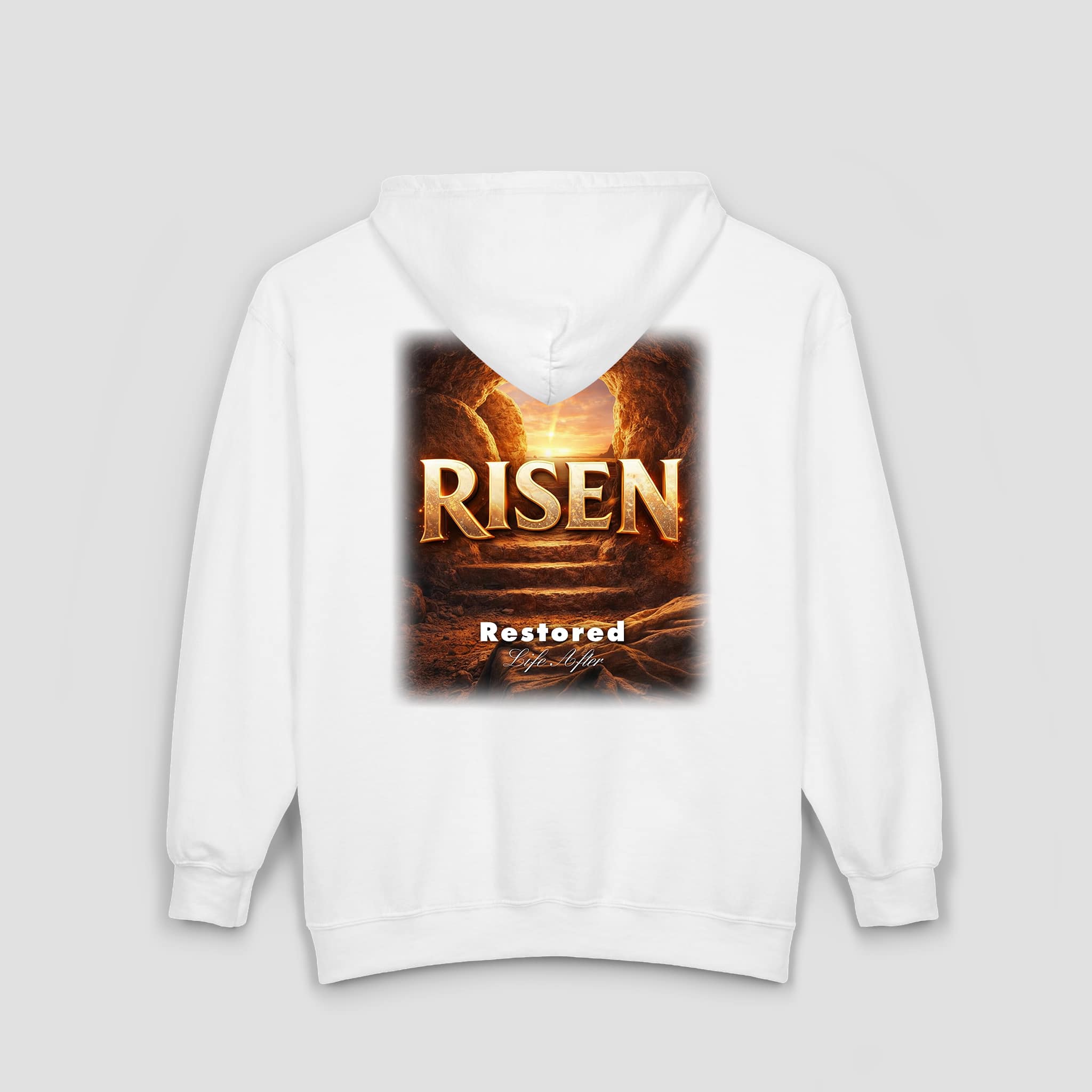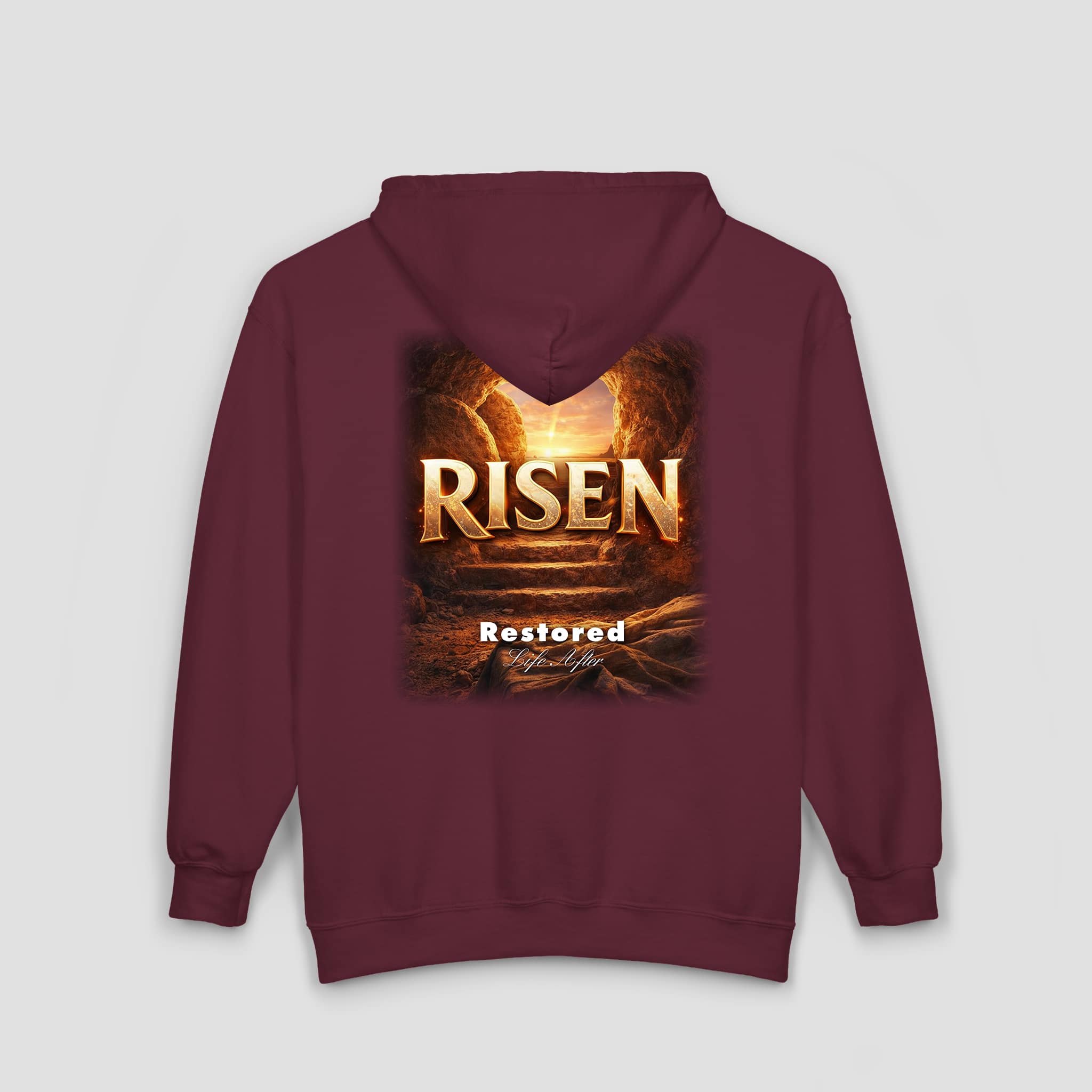 Celebrate faith, renewal, and redemption with the Risen Restored Christian Full-Zip Hoodie – Bible Verse Resurrection Sweatshirt. Designed to reflect the power of the resurrection, this hoodie features a sunrise-through-the-stone-tomb graphic on the back with the bold declaration “RISEN.” The left-chest embroidery reading “Restored” adds a subtle yet meaningful detail.